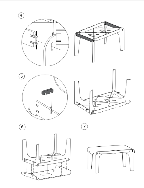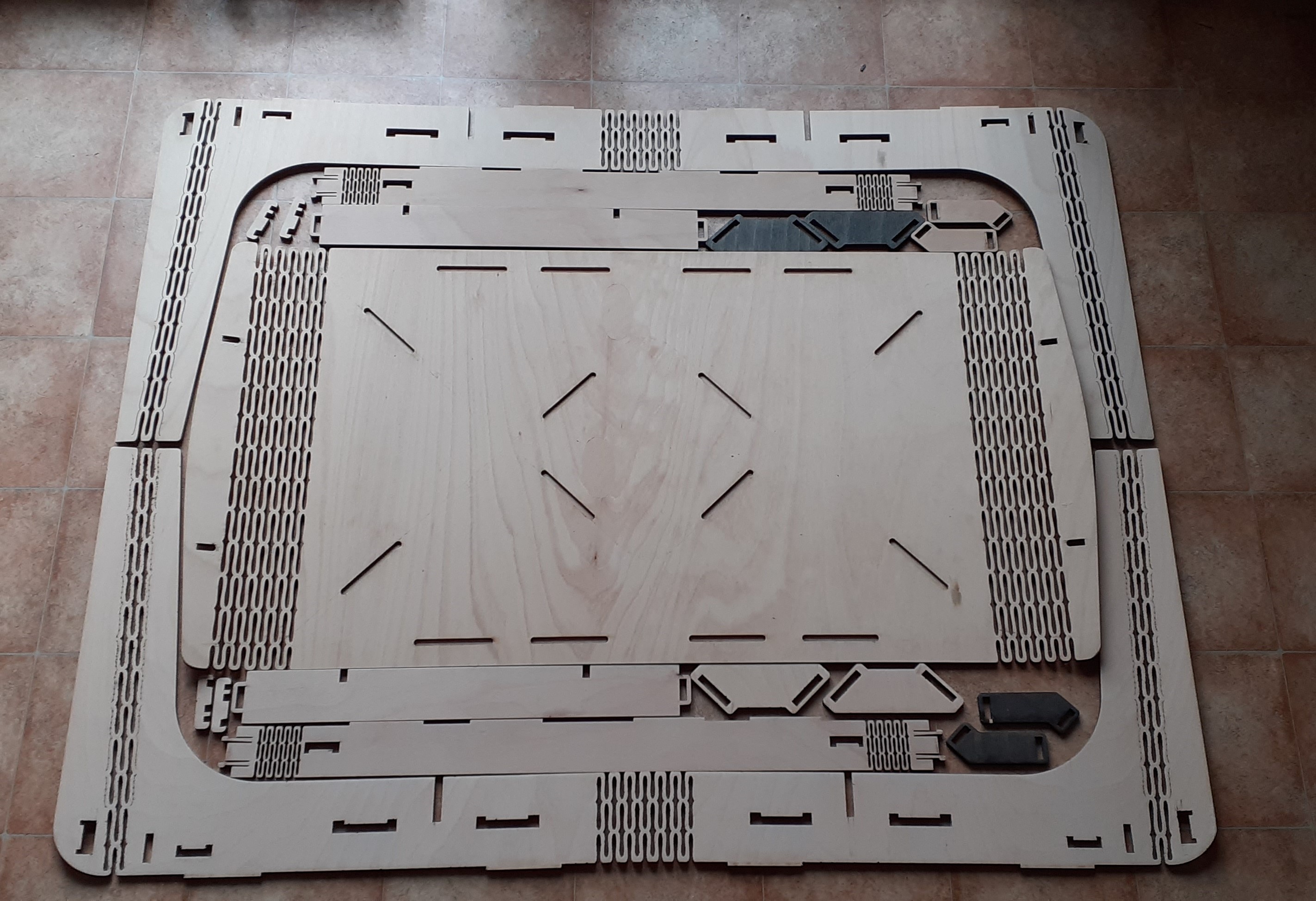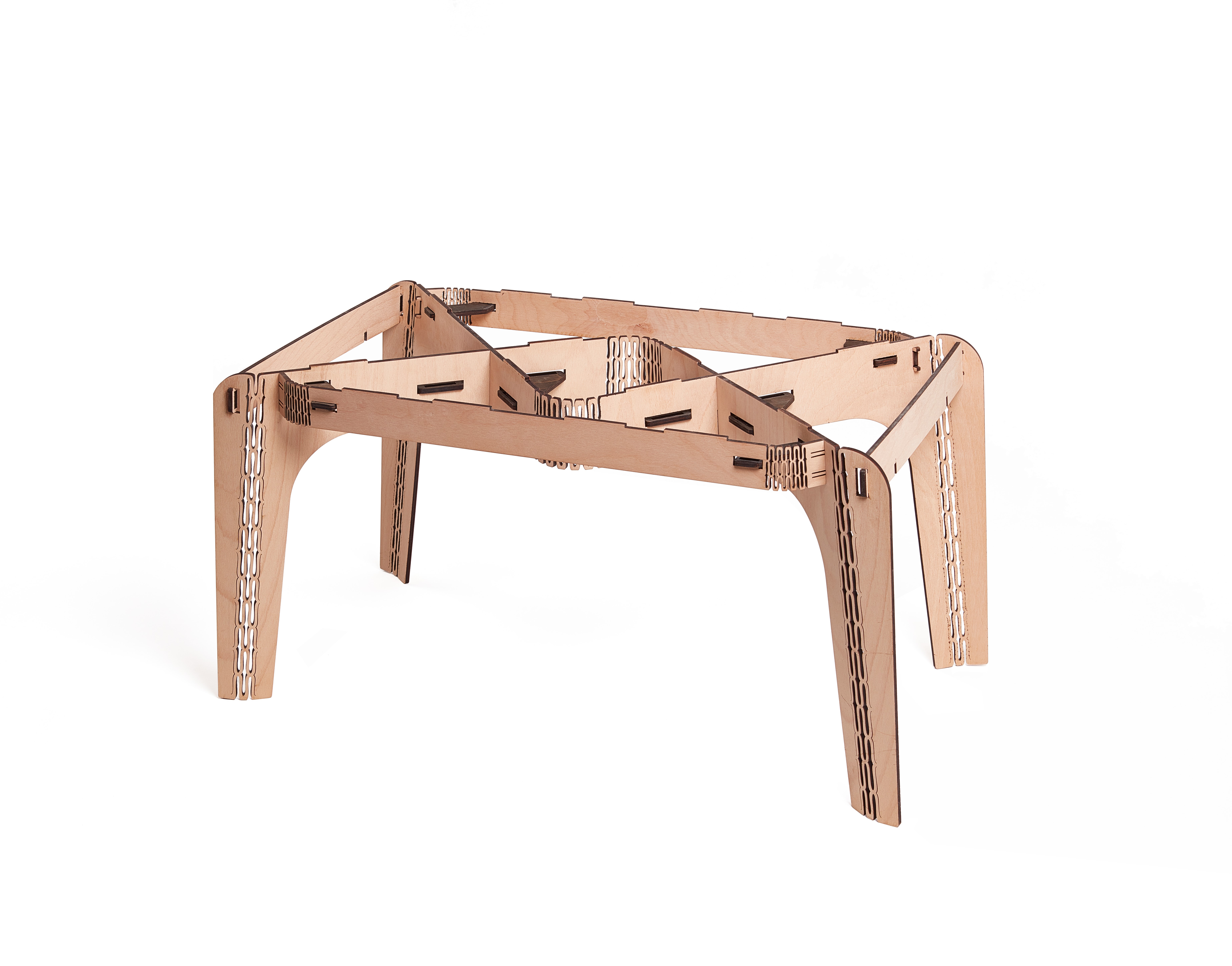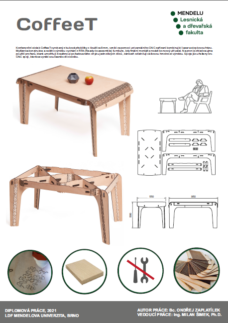 Konferenční stolek CoffeeT vyrobený z bukové překližky o tloušťce 8 mm, vznikl za pomoci univerzálního CNC zařízení kombinující laser a stopkovou frézu. Myšlenka konstrukce a celého výrobku vychází z RTA (Ready-to-assemble) furniture, kdy finální montáž provádí koncový uživatel. Na první pohled zaujme použití prořezů, které umožňují dosáhnout požadovaného ohybu jednotlivých dílců, zároveň odlehčují celkovou hmotnost výrobku. Spoje jsou řešeny tzv. CNC spoji, které se vyrábí současně s dílci stolku.