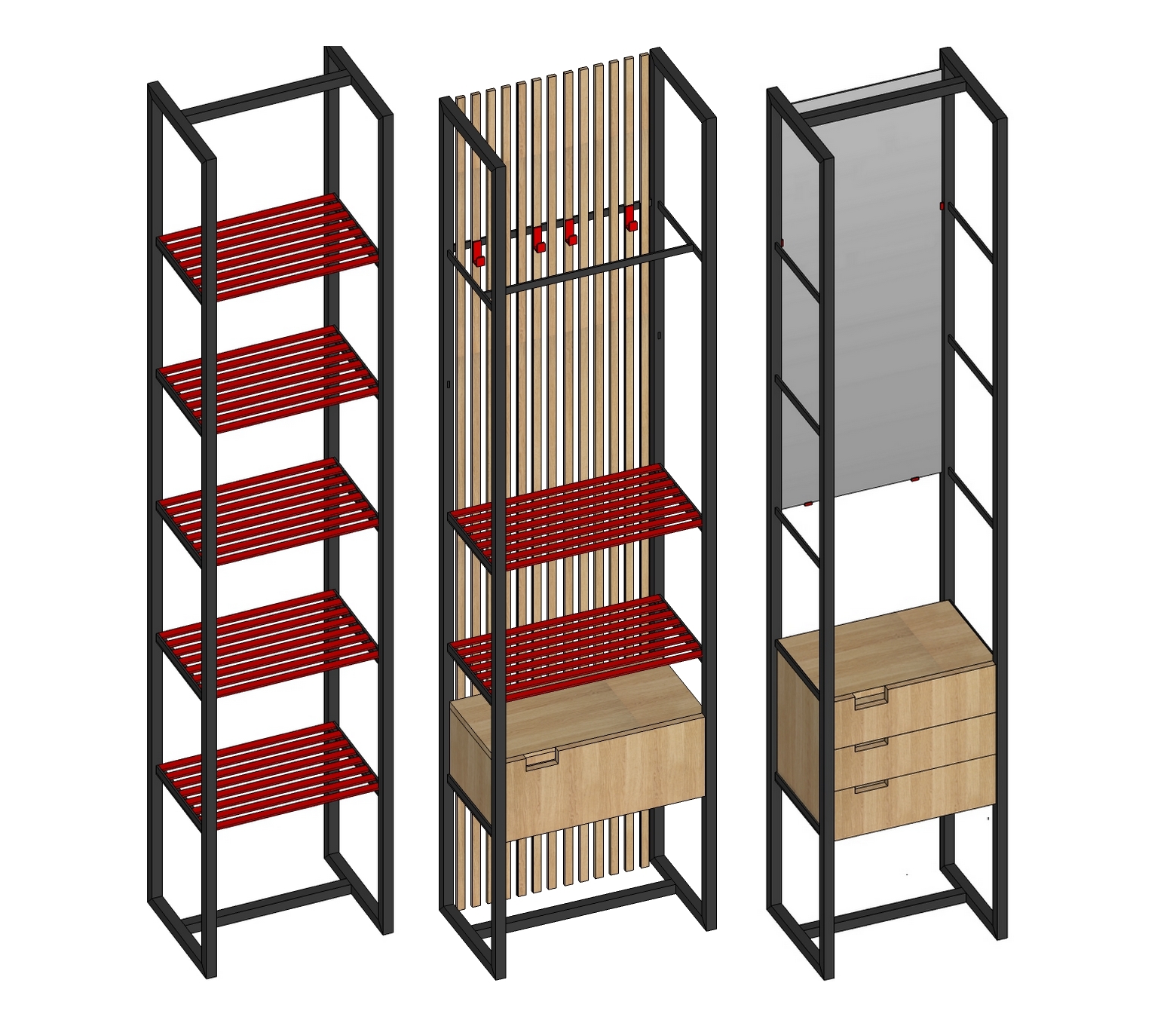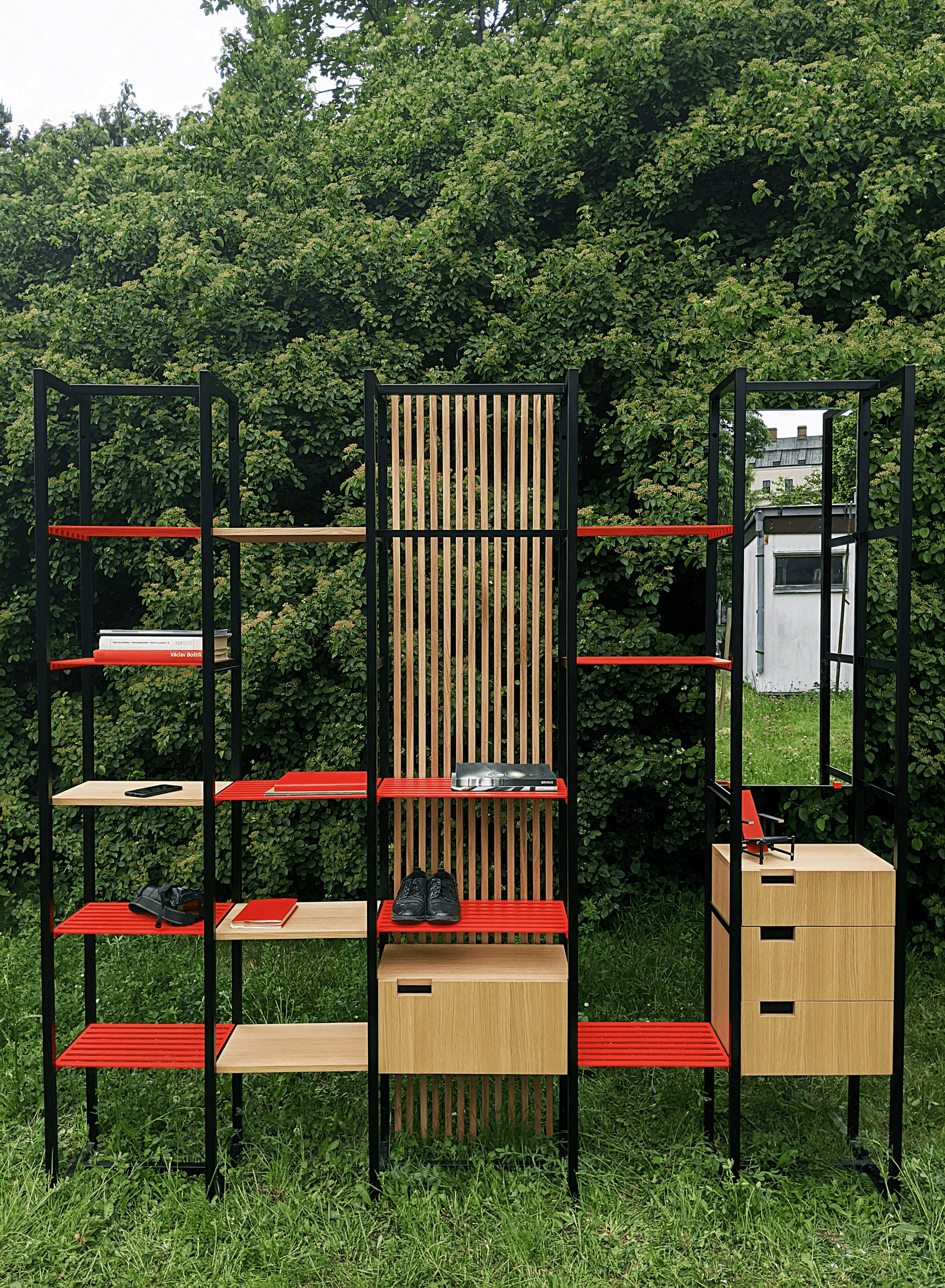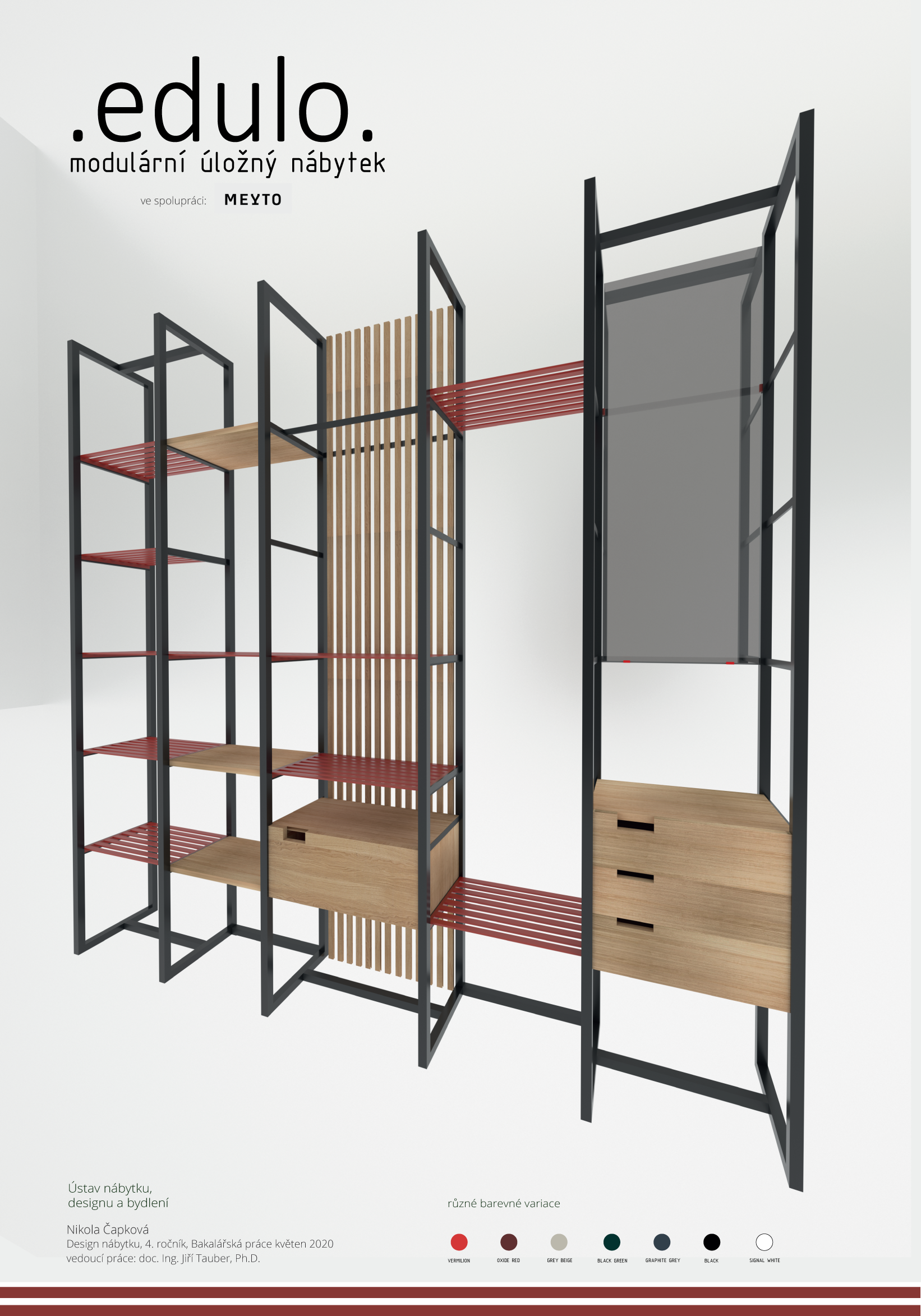 The main advantage of the EDULO storage system is the modularity between the individual parts. This creates several different assembly variants. The set contains 3 welded shelves, where everyone can choose different color variants of shelves. The same principle works with wooden shelves. The product is calculated with mass production (cost minimization). The simple shapes are complemented by, for example, a red color that underlines every unusual hall.