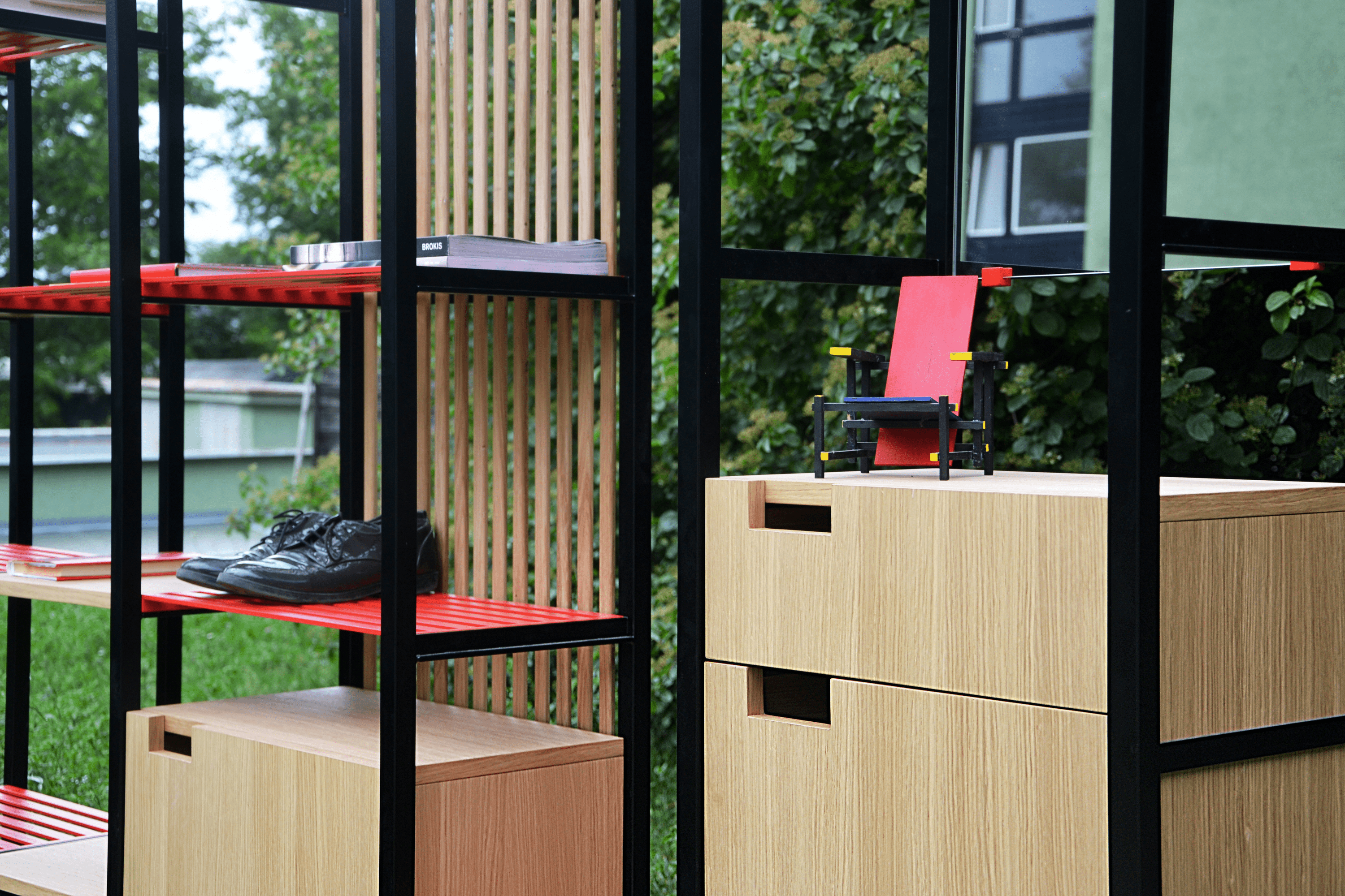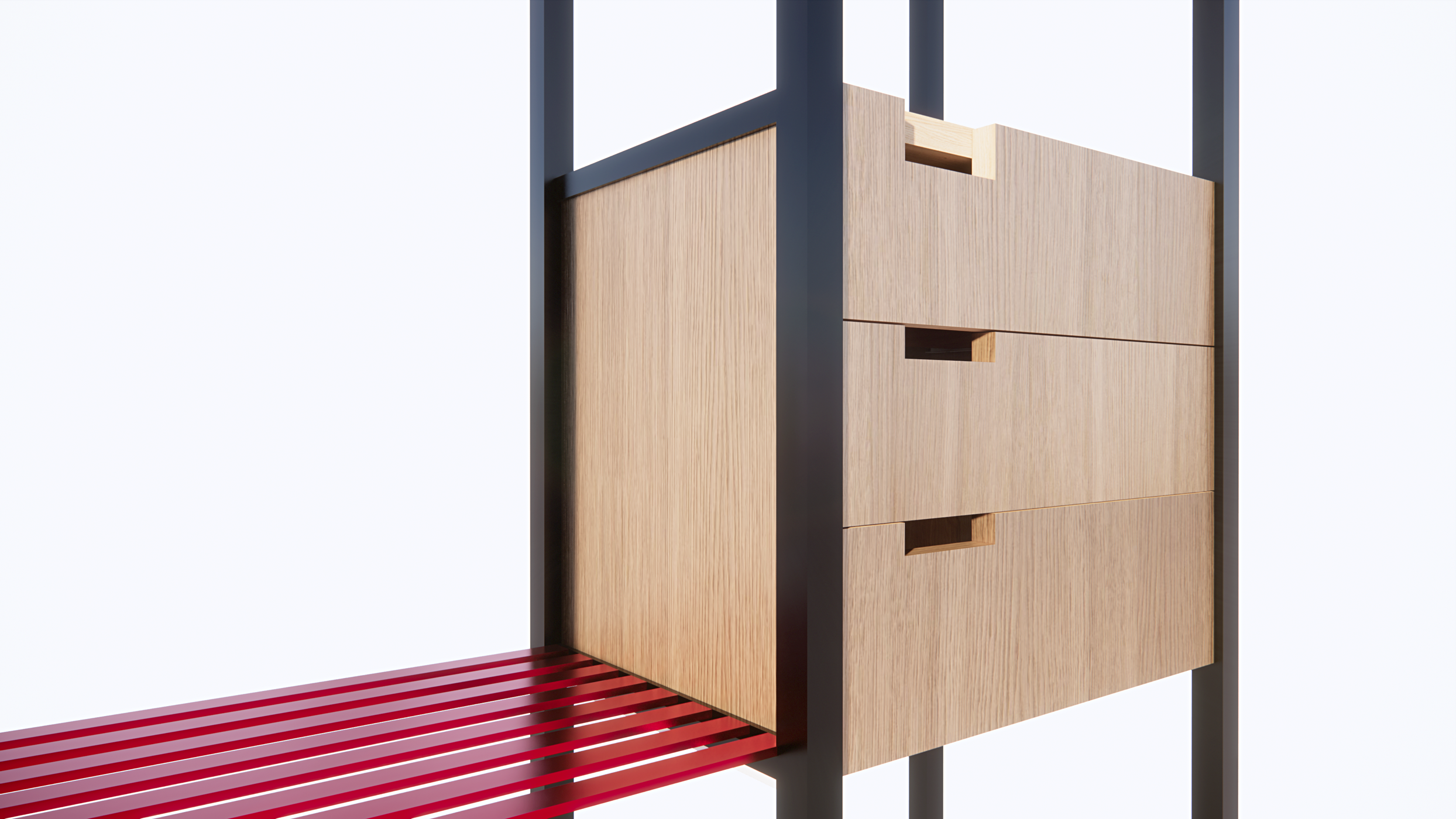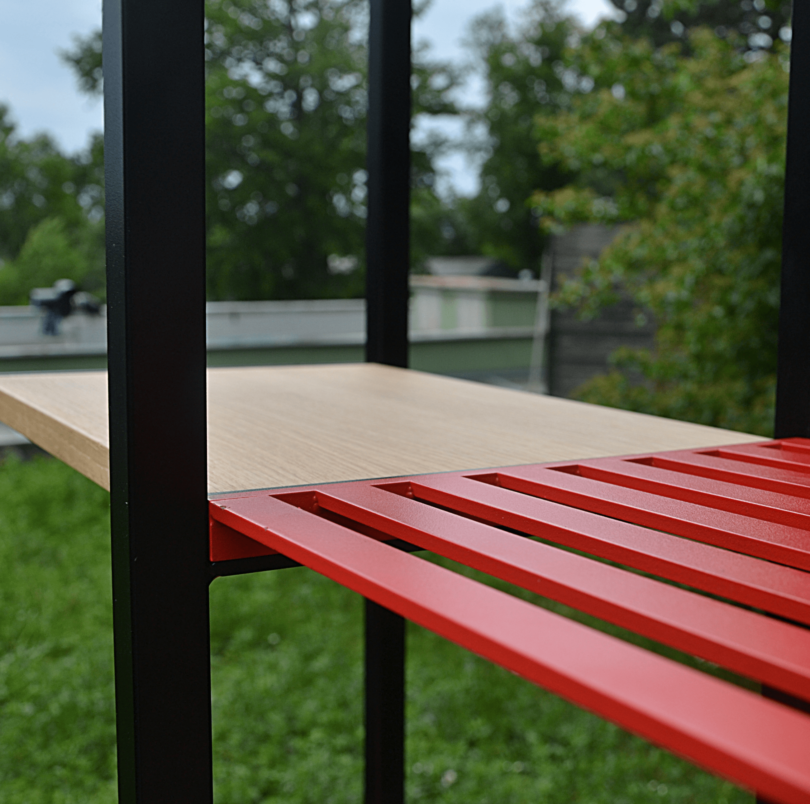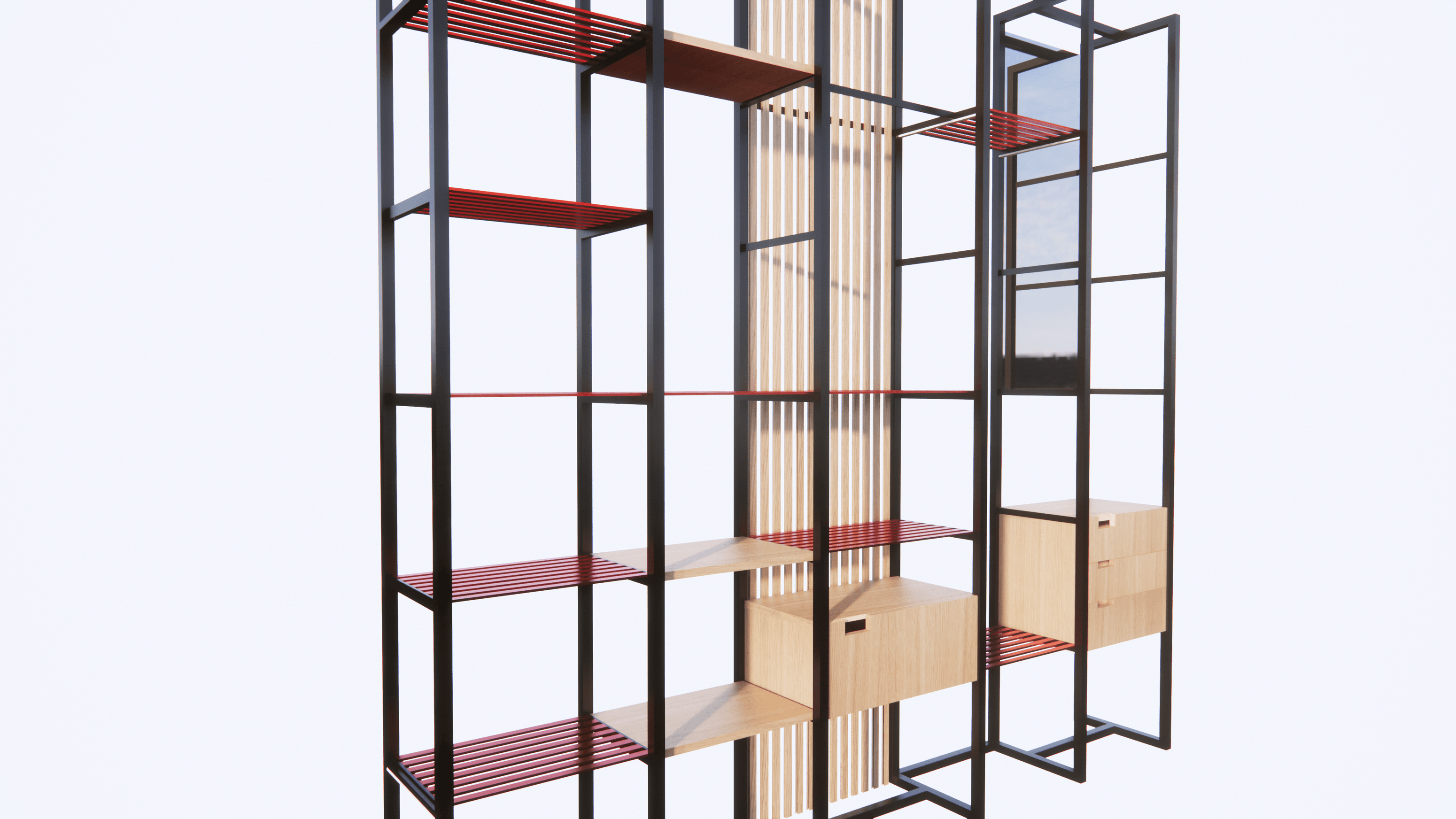 The main advantage of the EDULO storage system is the modularity between the individual parts. This creates several different assembly variants. The set contains 3 welded shelves, where everyone can choose different color variants of shelves. The same principle works with wooden shelves. The product is calculated with mass production (cost minimization). The simple shapes are complemented by, for example, a red color that underlines every unusual hall.